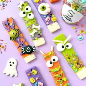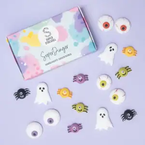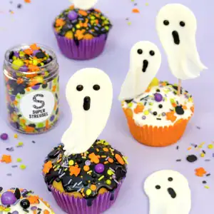 Keď hodiny odbijú čarodejnícku hodinu a čarodejnice naskočia na svoje metly, je čas na strašidelne lahodnú halloweensku párty. Oranžové duchovia, olivovozelené netopiere a ružové čarodejnícke klobúky dodajú vašim strašidelným tortám nádherne strašidelný vzhľad. Pridajte jemné čokoládové guľôčky vo fialovej, zelenej a oranžovej farbe a niekoľko konfiet a posýpok vo fialovej, oranžovej, čiernej a tmavozelenej farbe a máte dokonalý strašidelný vzhľad.