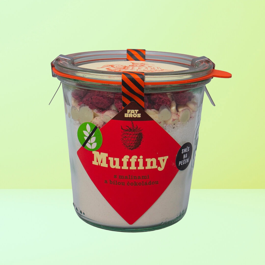 Bezlepkové muffiny s bielou čokoládou a malinami zmes na pečenie v dóze
