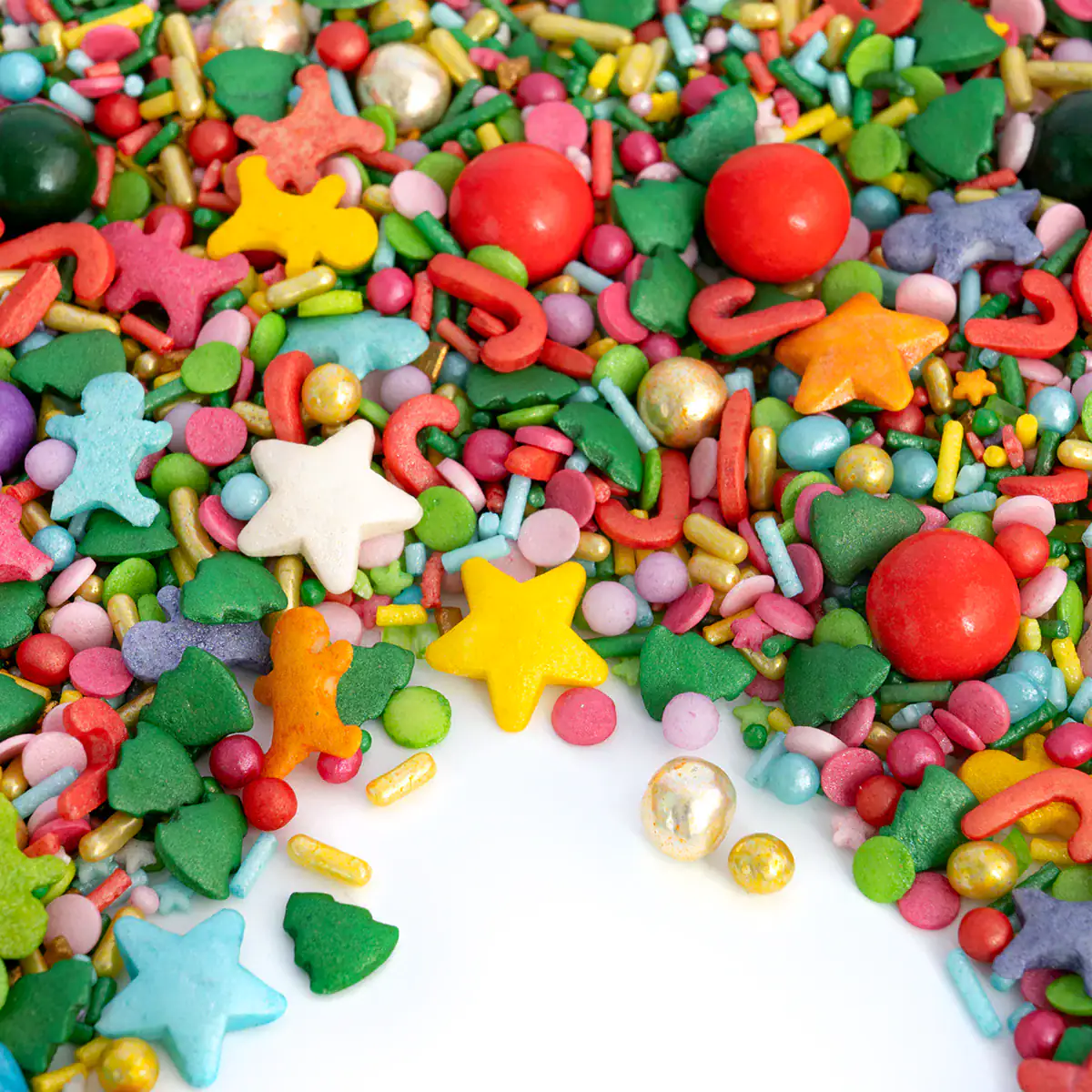 Súčasťou veselého vianočného zhonu sú pestrofarebné posýpky v tvare veľkých hviezd, sladké posýpky v tvare perníkového mužíka vo všetkých farbách, červené posýpky v tvare cukrovej trstiny a tmavozelené posýpky v tvare jedličky. Spoločne premenia vaše koláčiky na farebnú vianočnú ozdobu – ideálnu na pečenie a vychutnávanie si s celou rodinou.