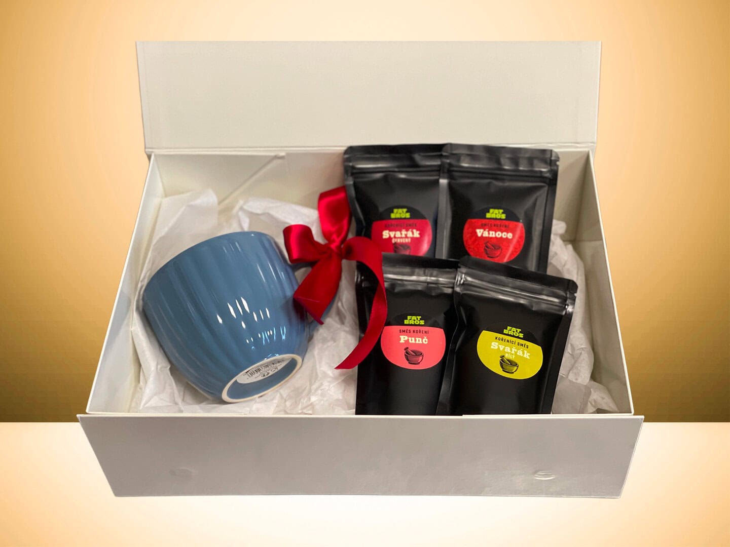 Darčekové balenie hrnčeka a nášho korenia na horúce nápoje - víno, punč, i na horúce džúsy. Vianočný prášok vám ovonia kakao alebo horúcu čokoládu. Všetko s bielym hodvábnym papierom v lesklej pevnej darčekovej krabičke s uzatváraním na magnet. Perfektný darček nielen na Vianoce.