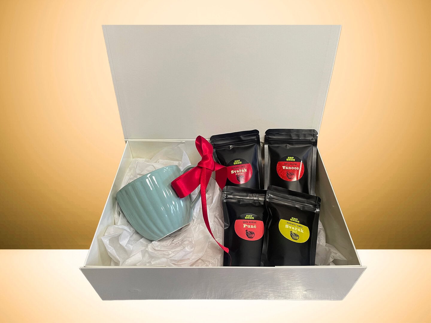 Darčekové balenie hrnčeka a nášho korenia na horúce nápoje – víno, punč, i na horúce džúsy. Vianočný prášok vám ovonia kakao alebo horúcu čokoládu. Všetko s bielym hodvábnym papierom v lesklej pevnej darčekovej krabičke s uzatváraním na magnet. Perfektný darček nielen na Vianoce.