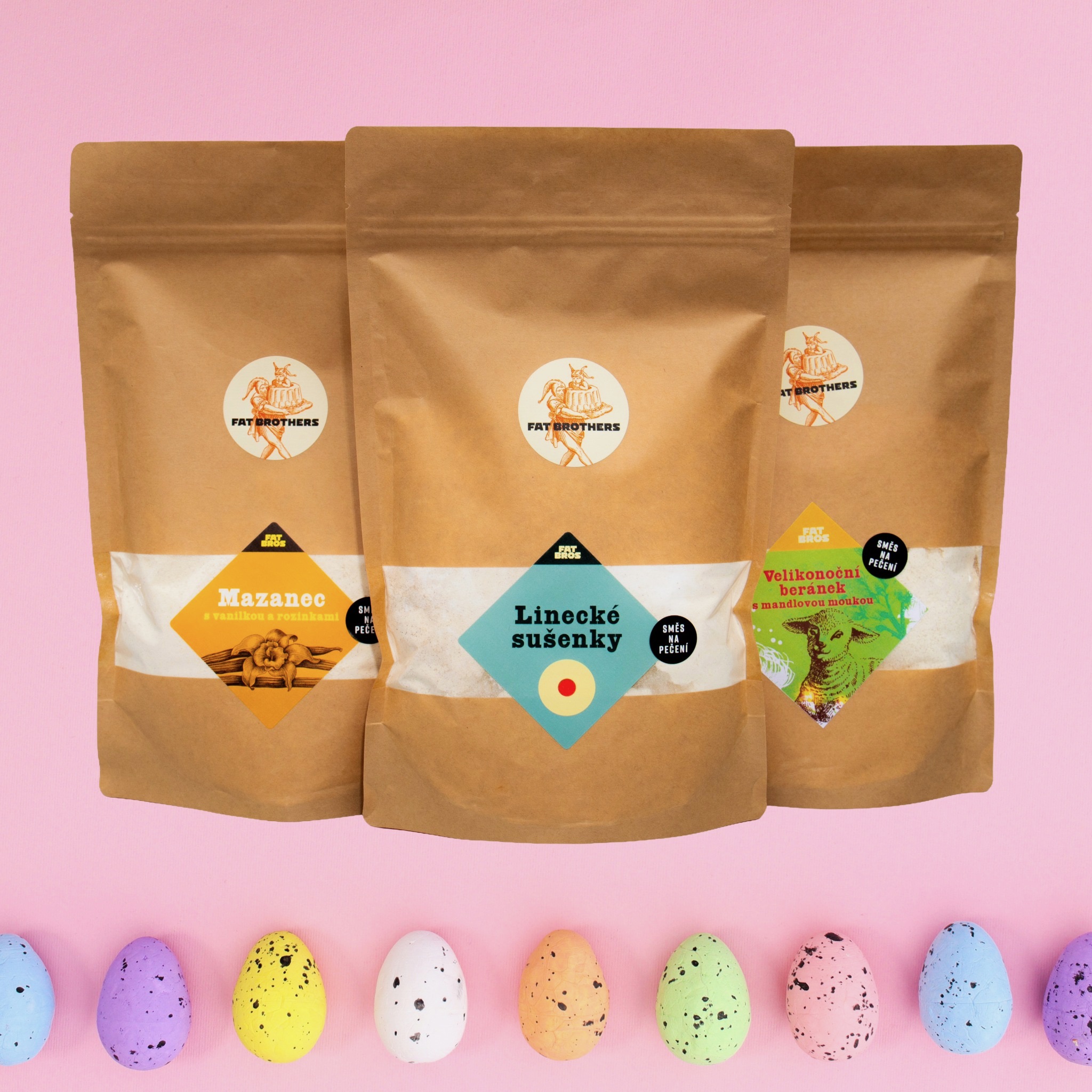Výhodná sada na pečenie obľúbených veľkonočných dobrôt. Nájdete v nej zmes na pečenie – veľkého barančeka, mazanca a lineckých sušienok. Recepty na polevy a zdobenie sušienok a koláča nájdete v balíčku.