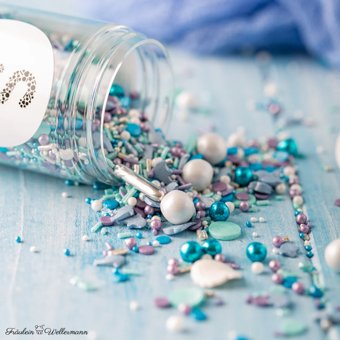 Popri modrých mini delfínoch a veľkých bielych posýpkových mušlí je tu množstvo malých modrých konfiet rôznych veľkostí a tiež tony bublín blubbblubbblubber vyrobených z bielych posypových perál a konfetiek. Pridajte k tomu jasnomodré mini chrumkavé guľôčky, veľké, jemné guľôčky z bielej čokolády a strieborné cukrové tyčinky. Ach, vy krásne stvorenia. Toľko zvukov oceánu v jednej plechovke… keby mohol, Poseidón by od radosti mával svojím trojzubcom!