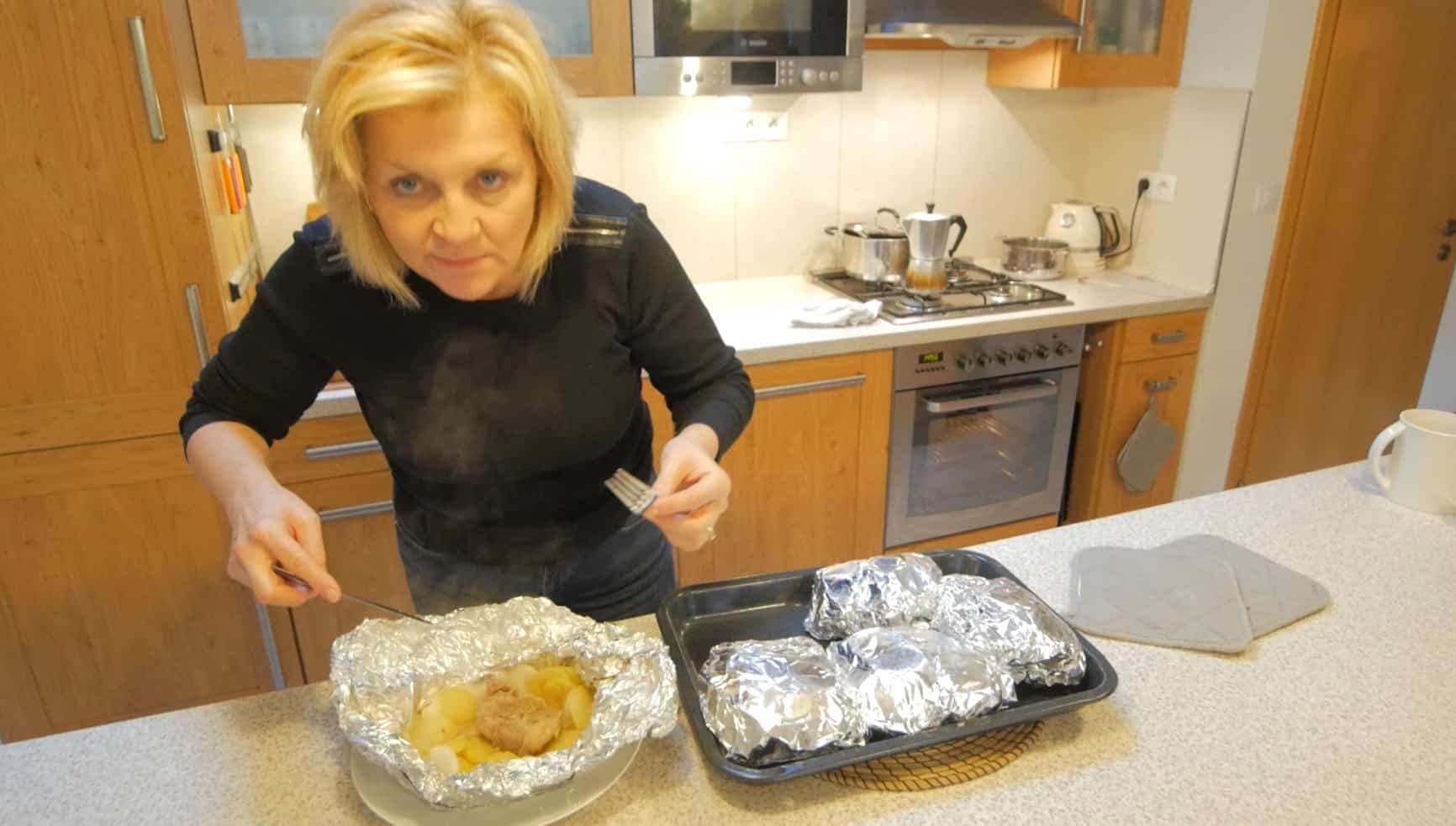Pripravíme si kusy alobalu, dva na jeden kus mäsa. Na spodok dáme olej, 2-3 zemiaky, 1 cibuľu na každý balíček. Posolíme, pokoreníme.